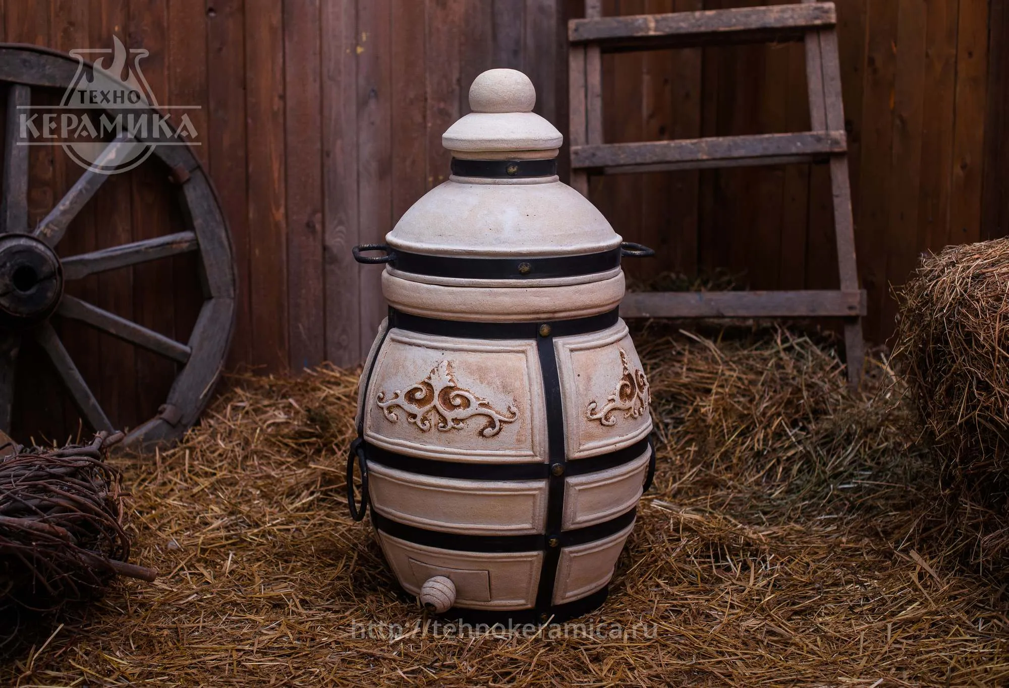 Тандыр "Аполлон" выполнен в виде овального бочонка среднего объёма. Кованная подставка - ножки обеспечивает удобное использование тандыра. Красоту тандыру придаёт орнаментальный растительный узор, расположенный в центральной его части. Керамический тандыр в основном выполнен в бежевом цвете, коричневый цвет добавлен в области орнамента. На поверхность орнамента нанесена глазурь, которая защищает его от влаги и грязи.