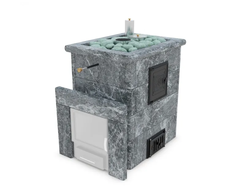 Талькохлорит обладает гладкой поверхностью, высокой плотностью и представляет собой горную породу, состоящую из магнезита, талька и хлорита. Талькохлорит обладает особенным матовым, шелковистым блеском и как правило, это камень серого цвета, который в зависимости от примесей в его составе может иметь белый, коричневый, желтоватый или зеленоватый оттенок, реже – темно-вишневый или красный цвет. Печи, облицованные талькохлоритом, являются одним из наилучших решений для обустройства бань, они способны поддерживать на стабильном уровне температуру и влажность в парильном помещении. Талькохлорит обладает очень высокой теплоемкостью, которая в два-три раза превышает соответствующий показатель печного кирпича. Всего за два-три часа работы печь, облицованная символичным огненным камнем, способна накопить тепла столько, что его будет достаточно для поддержания температуры в помещении в тече