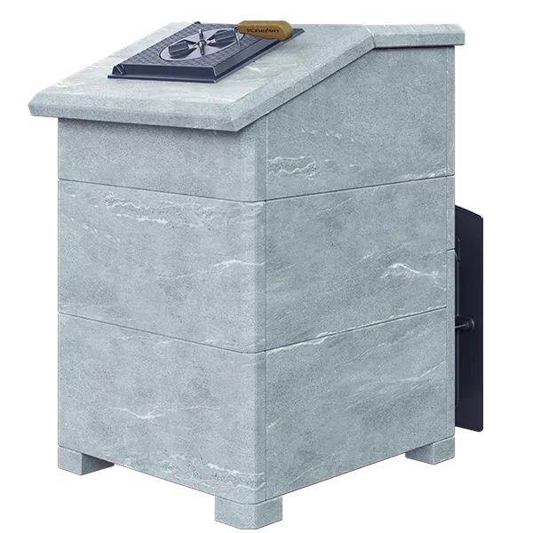 Облицовка представляет собой сборную конструкцию, состоящую из каменных плит толщиной от 30 до 60мм. Для крепления плит используются металлические планки вставляемые в пазы смежных плит. Внутренняя поверхность всех плит находится на расстоянии от 10 до 50мм от корпуса топки образуя пазу