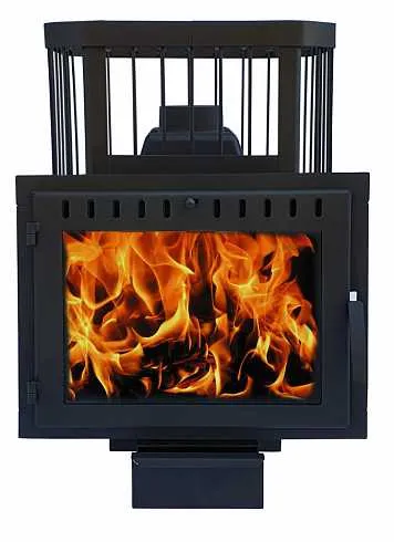 По периметру печи расположена сетчатая стальная конструкция, которая заполняется большим количеством камней, выполняющих функцию мощного аккумулятора и обладающей высокими теплоемкими свойствами. Масса камней, способных разместится в данной модификации печи составляет 180 кг, что создает неповторимую эстетику внутри бани и гармонизирует внутреннее прост