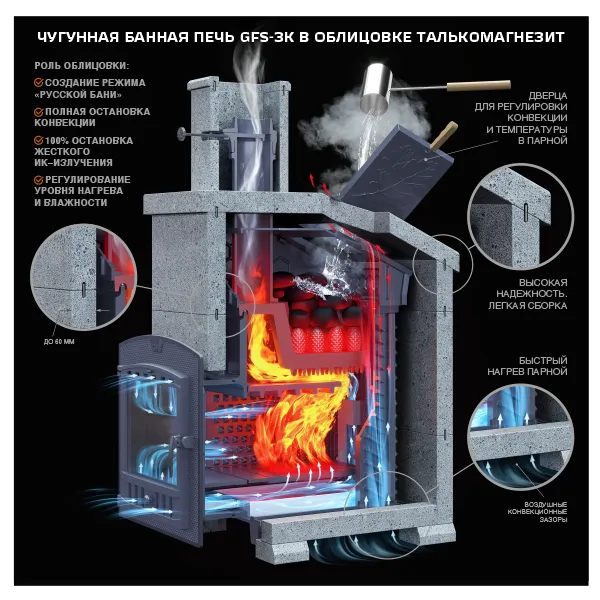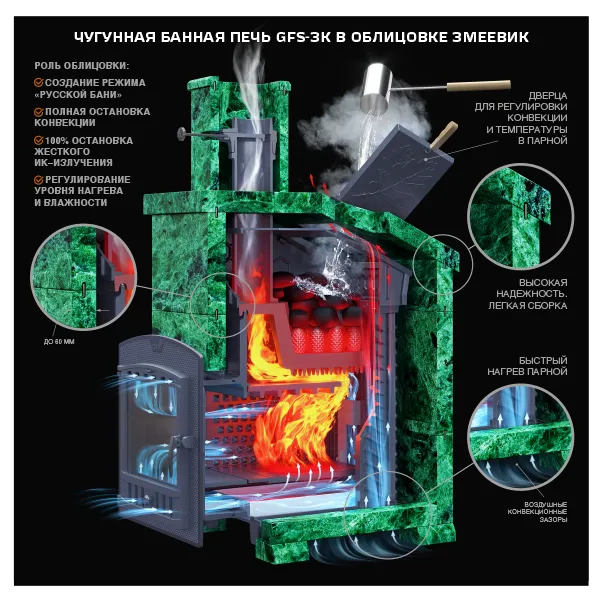 ✔ Закрытой каменке (ЗК) – дольше удерживает тепло и защищает камни от перегрева.