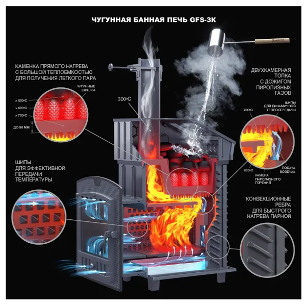 ✔ Теплоёмкой каменке с теплосъёмными шипами – пар получается мягким и комфортным.