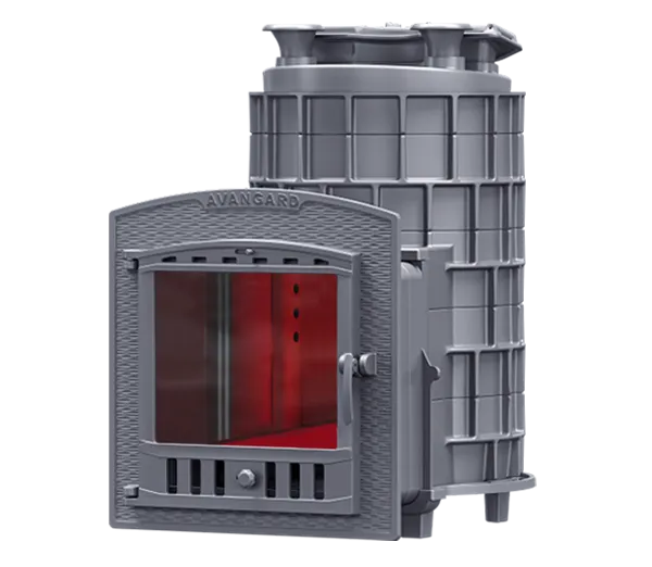 Масса пароиспарителя в печи Аванград 30 – 56 кг, и он нагревается прямым контактом с пламенем. У пароиспарителя 2 поверхности с увеличенной рабочей площадью – снизу идёт нагрев огнём, а сверху поддаётся вода для пара. Для увеличения площади испарения и нагрева первых слоёв камней на каменке отлиты высокие шипы.