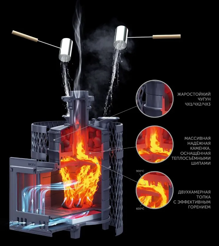 Модификация "Искандер ЗК" - это печь "Искандер" с закрытой каменкой, двумя паровыми пушками и дверцей для залповой подачи пара.
