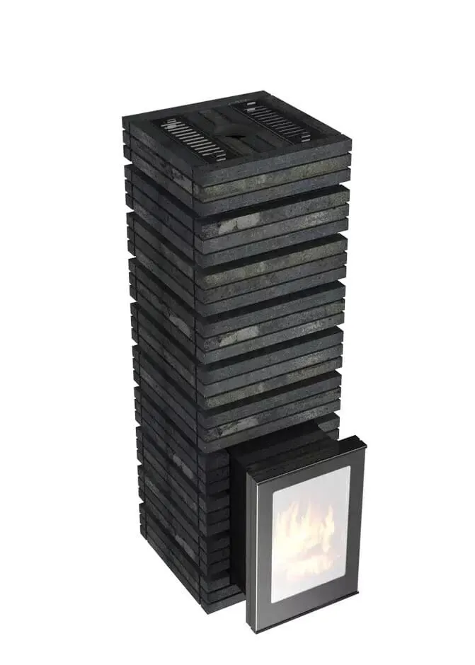 Выносная топка, полностью стеклянная дверца с системой охлаждения и режимом каминного горения. Безграничные возможности конфигурации по высоте и функционалу. Подключение дымохода может быть открытым и скрытым. Сверху печи есть регулировка конвекции, с её помощью создаётся комфортный температурный режим в парилке.