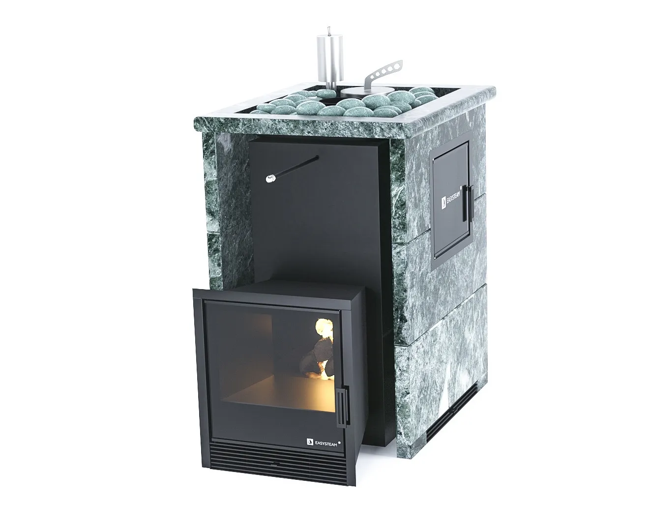 Закрытая каменка и встроенный парогенератор гарантирует большое количество легкого пара, а огонь, пылающий за панорамным стеклом подарит атмосферу тепла и уюта в вашей бане.