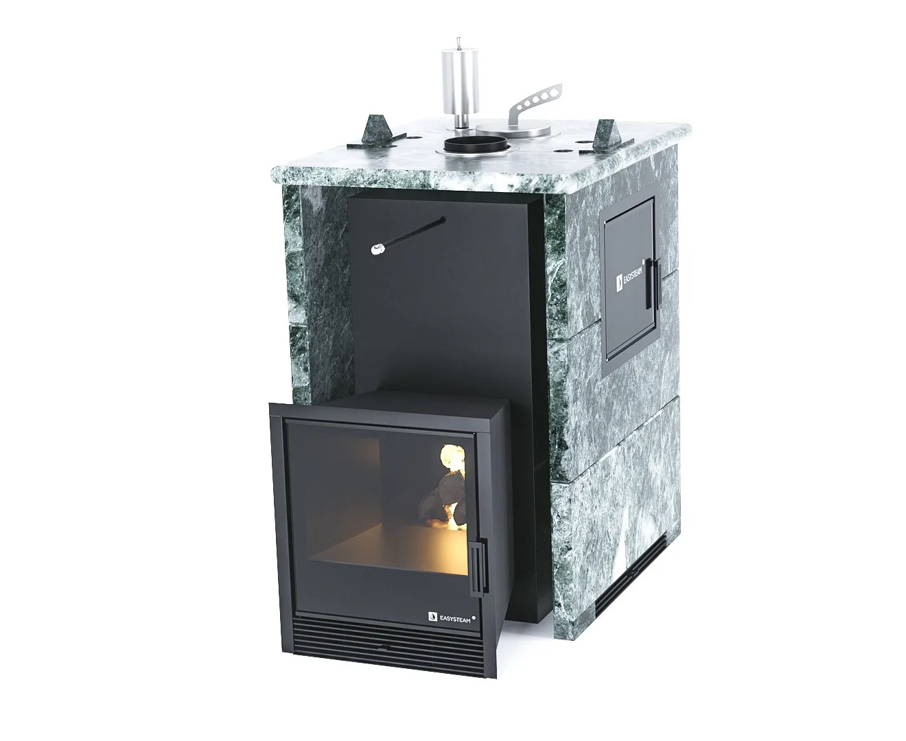 Закрытая каменка и встроенный парогенератор гарантирует большое количество легкого пара, а огонь, пылающий за панорамным стеклом подарит атмосферу тепла и уюта в вашей бане.