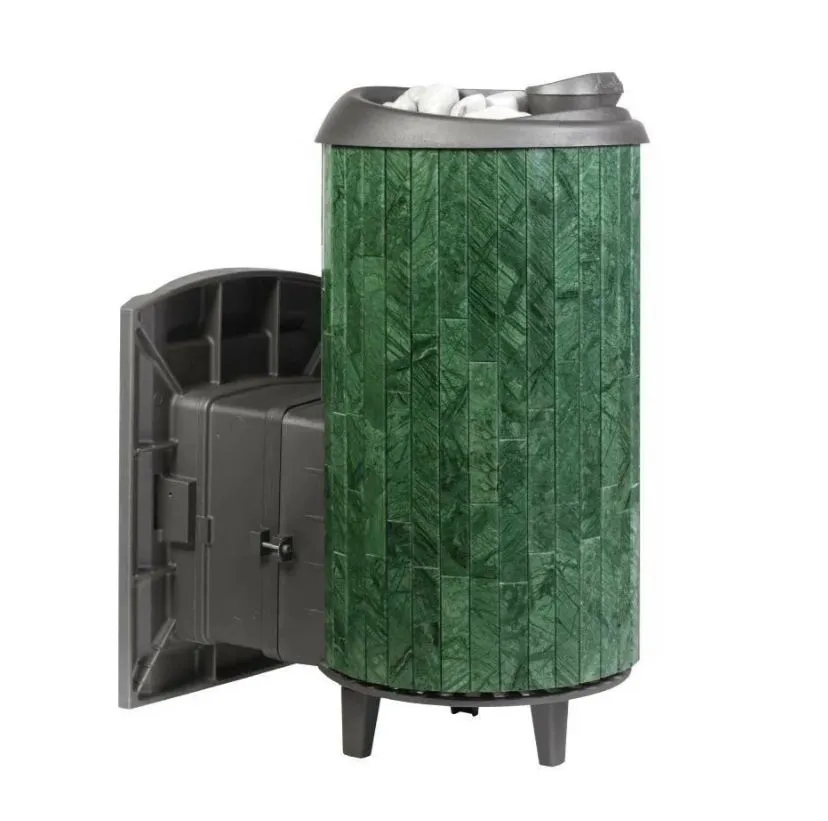 Модель с увеличенной каменкой и повышенной производительностью. Ламели из мрамора придают конструкции печи целостность и оригинальный внешний вид