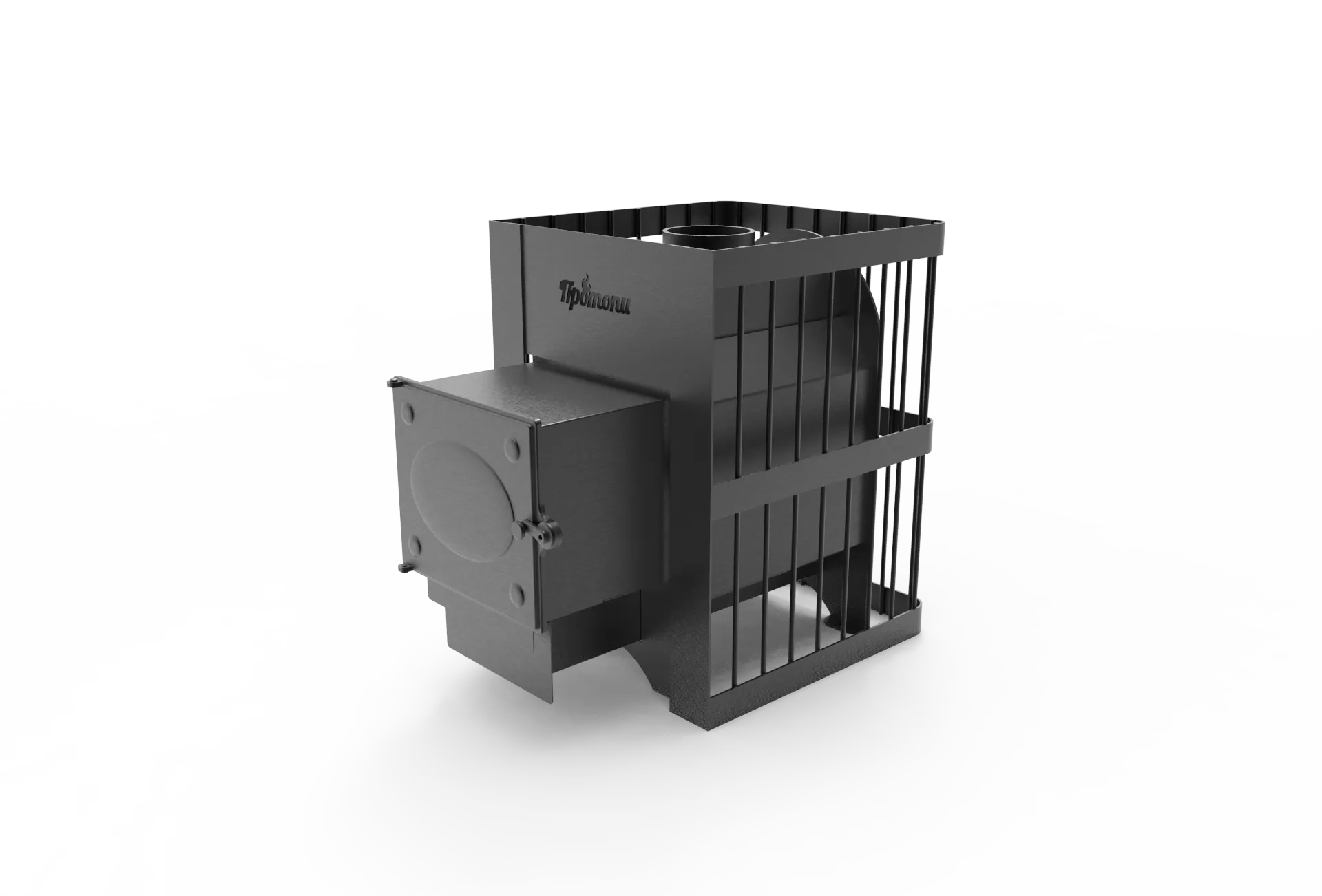 Благодаря круговому контакту каменки с топкой печи прогрев парилки и камней происходит очень быстро. Интенсивность горения топлива регулируется изменением положения зольного ящика.