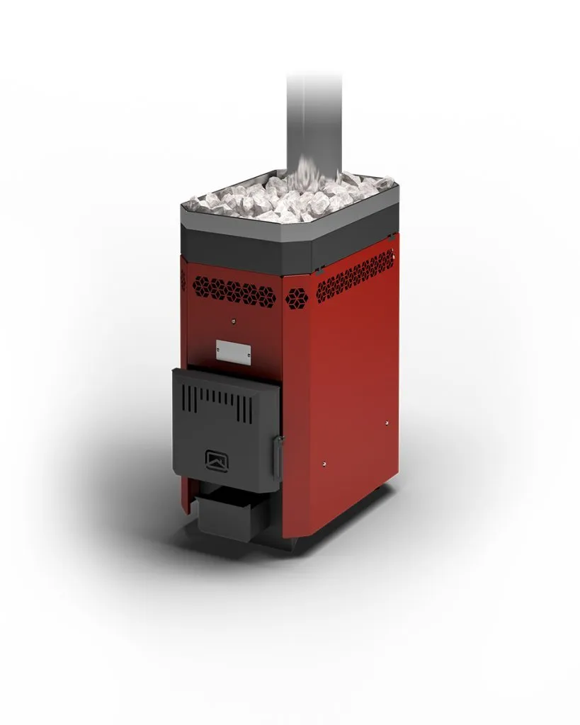 Выход дымовой трубы смещен от края к центру каменки, что значительно упрощает монтаж дымохода.