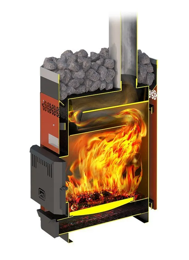 Л – топка печи выполнена из высоколегированной стали с содержанием хрома до 13%. Термически нагруженные элементы печей для бани изготавливаются из стали с содержанием хрома до 17%. Кожух–конвектор печи окрашен кремнийорганической термостойкой эмалью.