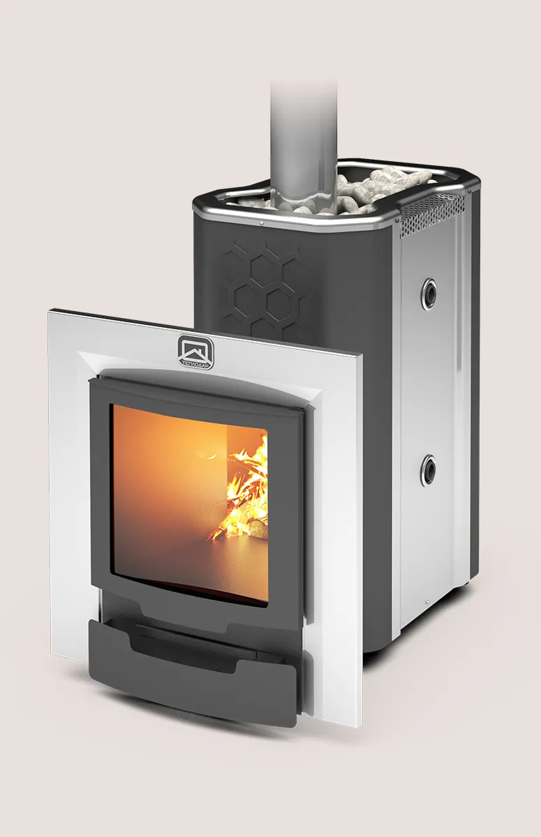 Удобный доступ к камням, благодаря смещенному к передней стенке печи выходу дымохода.
