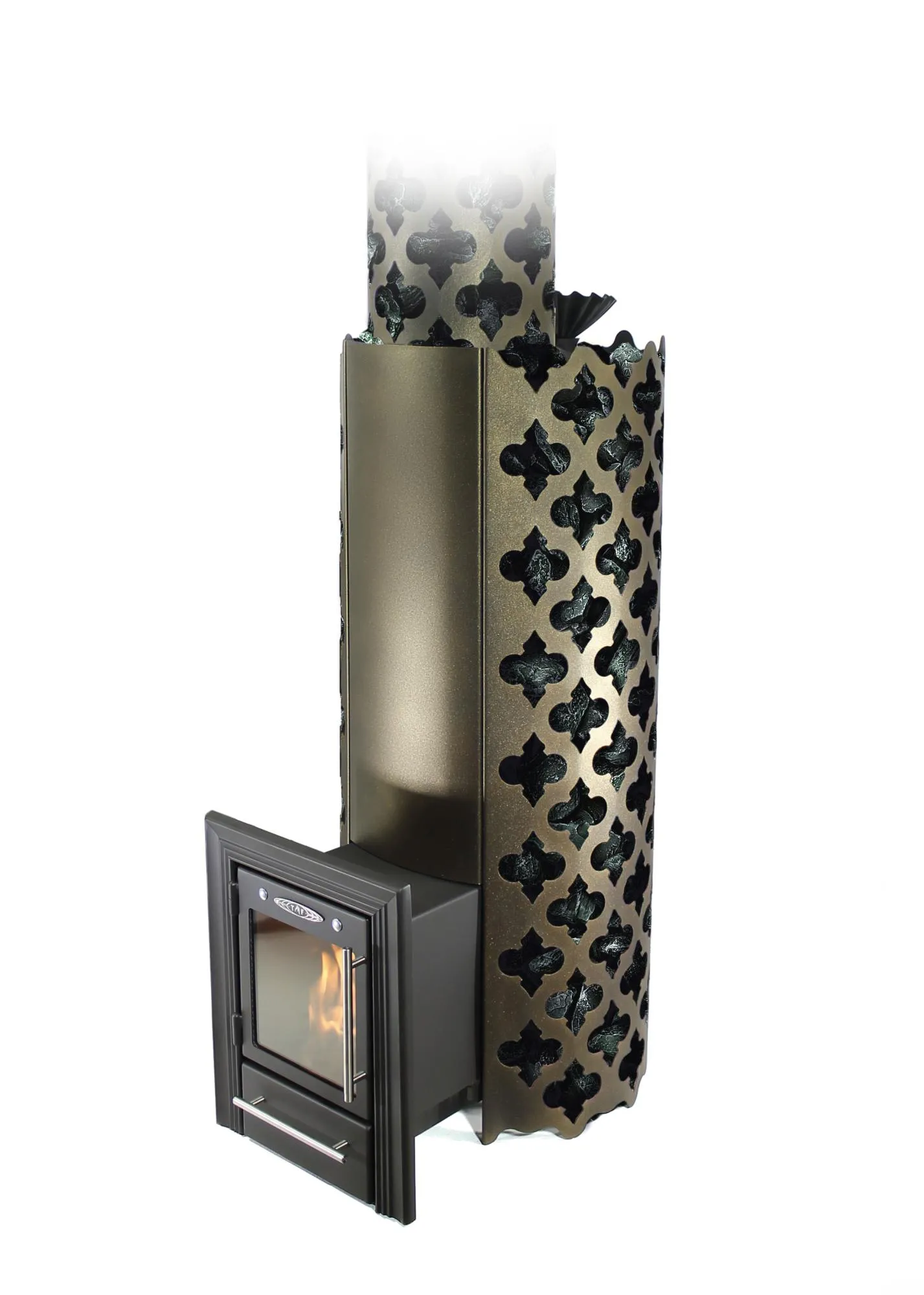 Главное отличие этой компоновки от компоновок других банных печей в том, что топливный канал печи выполнен из жаростойкой стали, в котором можно и нужно сжигать дрова. Благодаря такой компоновке конструкции можно использовать дрова длиной более 50 см, при этом печь имеет крайне малые размеры в плане и занимает минимальное место в парной.