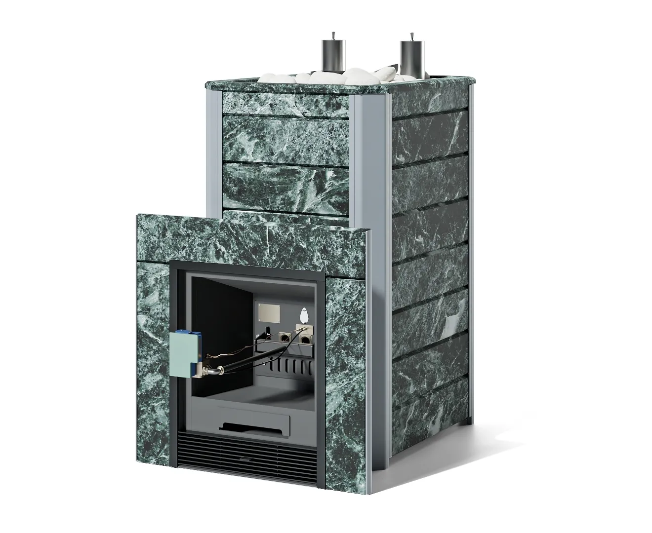 Печь оснащена съёмной закрытой каменкой, позволяющей разогревать находящиеся в ней камни до температуры 600 градусов.