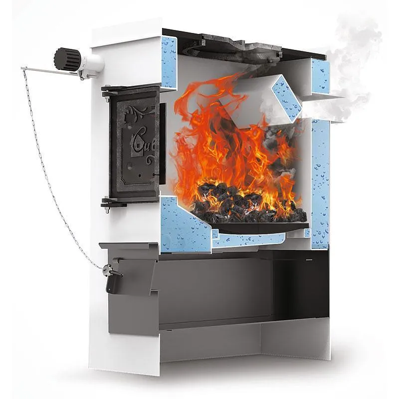 • Специально разработанная конструкция котла позволяет максимально использовать тепловую энергию при сгорании топлива, при этом стальную плиту можно использовать для приготовления пищи и подогрева воды.