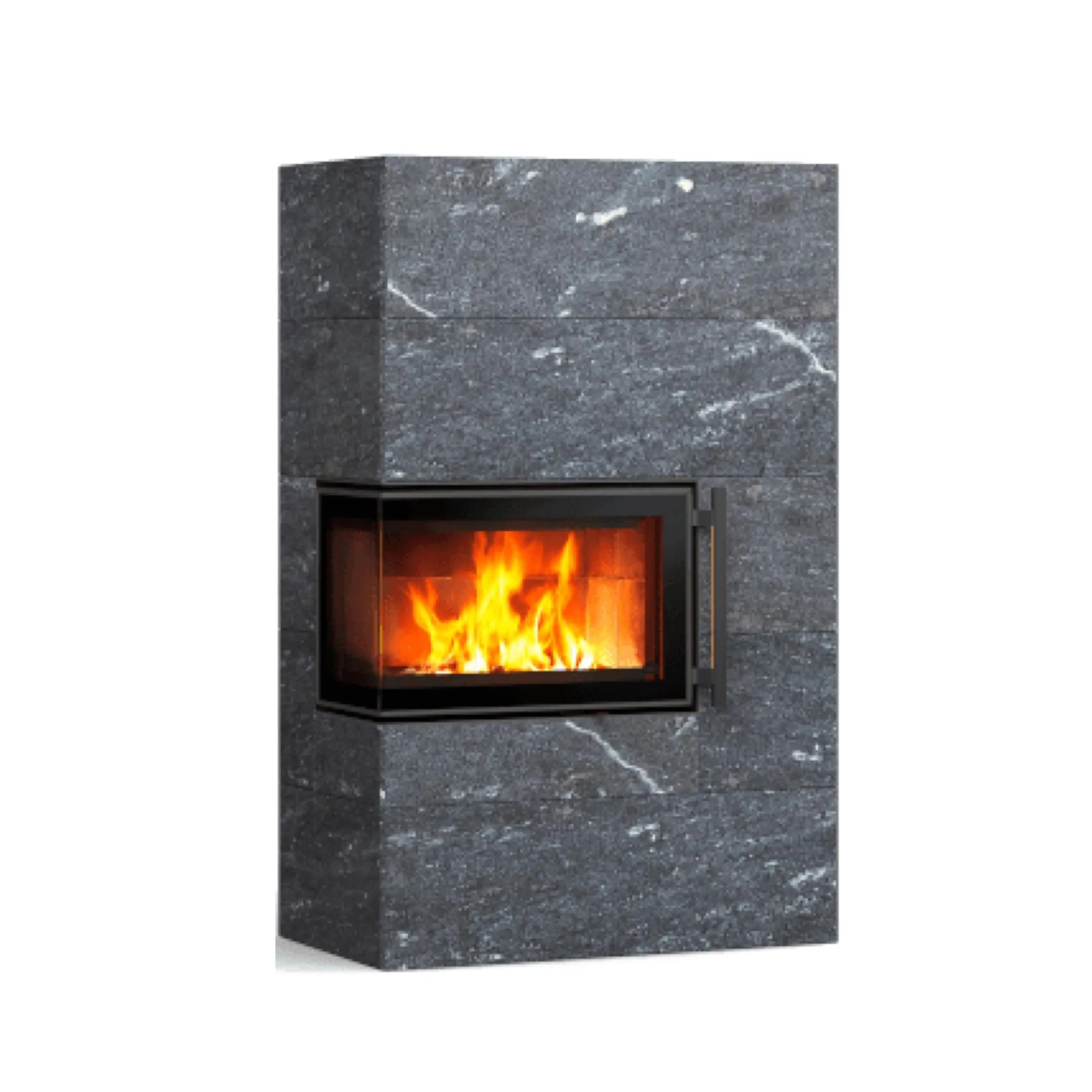 Большая L-образная дверца (65х35см) может быть установлена справа или слева, что упрощает размещение камина в помещении.