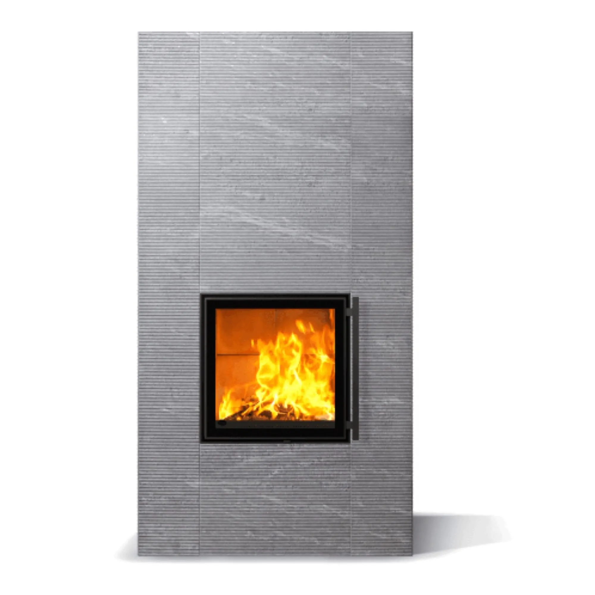Большая чугунная дверца с двойным стеклом позволяет снизить тепловое излучение через дверь и в то же время безопасно наслаждаться красотой огня. Тыльная сторона ручки сделана из дерева. Боковые дымовые каналы позволяют полностью прогревать всю печь.